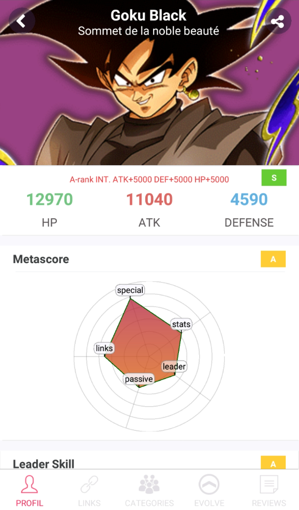 Cette page contient également la notation Metascore calculée par Dokkaner. Cette notation vous permet de distinguer facilement les forces et les faiblesses d'une carte. En plus d'un graphique illustrant la synthèse de la carte, vous trouverez une notation pour chaque skill et attribut d'une carte.