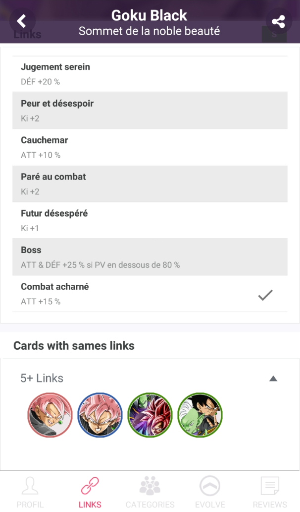 En plus de lister les liens disponibles pour la carte, cette page permet d'afficher les personnages ayant le plus grand nombre de liens en commun avec celle-ci. Le but ici est de permettre facilement d'identifier les synergies entre les cartes.