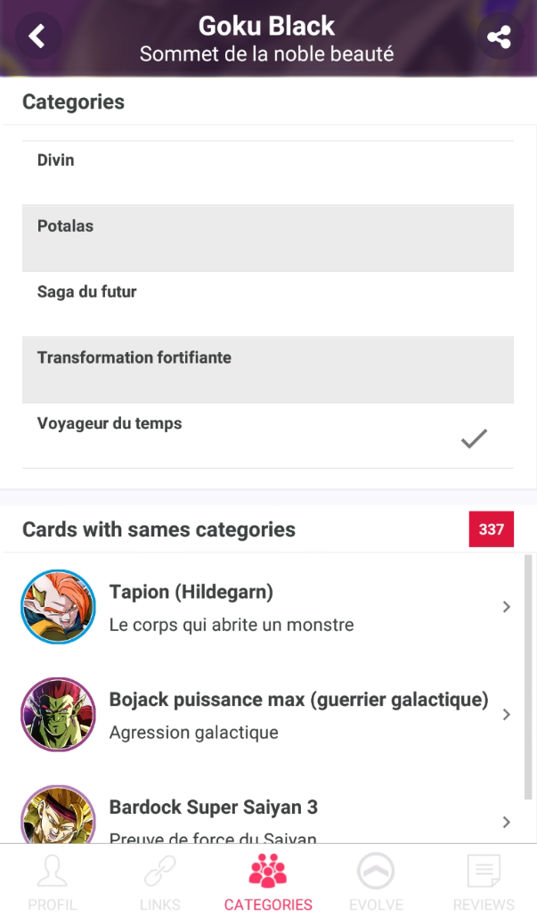 Cette page liste l'ensemble des catégories appartenant à la carte. Tout comme la page des Liens, on retrouve également les cartes partageant les mêmes catégories que le personnage en question. Il est également possible de cliquer sur la liste des catégories pour filtrer la sélection de personnages affichés.